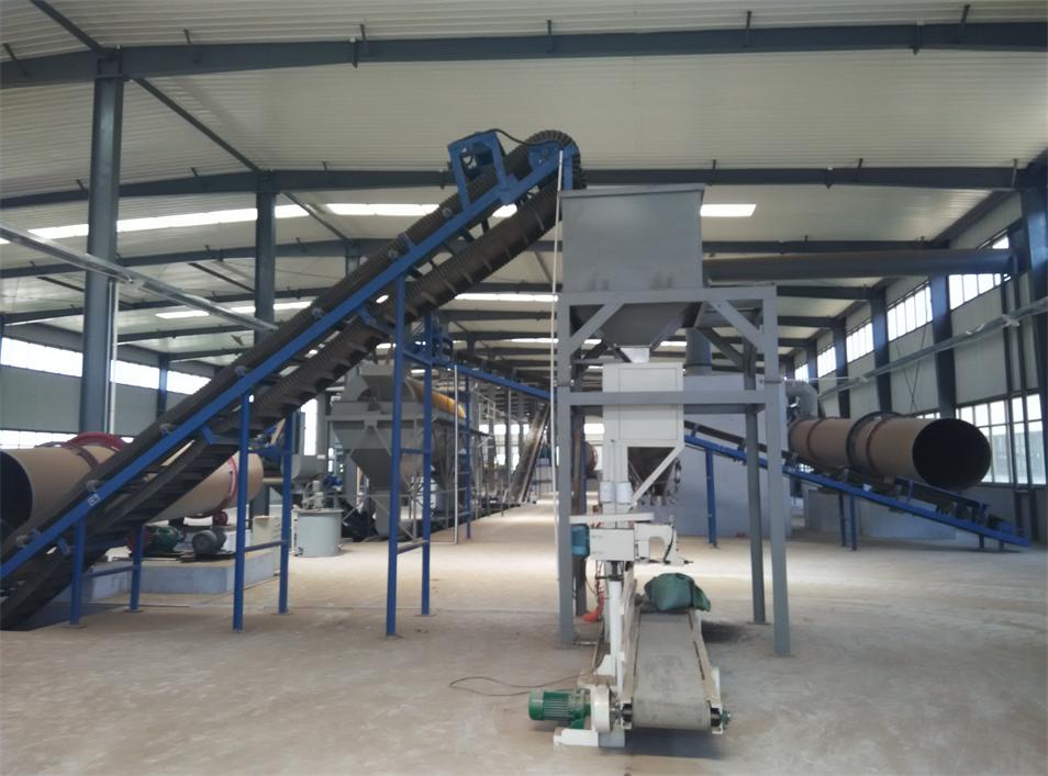 The main machines for the organic compound fertilizer drum granulator production line: Automatic batching system, grinding machine, mixing machine, rotary drum granulator, rotary dryer machine, rotary cooler machine, rotary screener, rotary coating machine, packing machine, PLC controller, and belt conveyor to connect each machine.